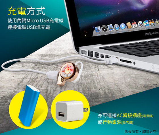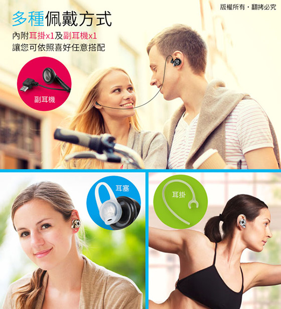包裝內容物:藍牙耳機麥克風x1、副耳機x1、耳掛x1、充電線x1、說明書x1